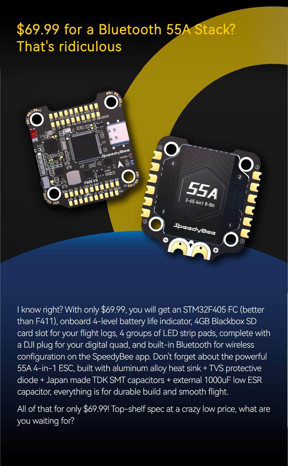 - 1x SpeedyBee F405 V4 BLS 3-6S 30x30 Stack/Combo (F405 FC / 8Bit 55A 4in1 ESC)