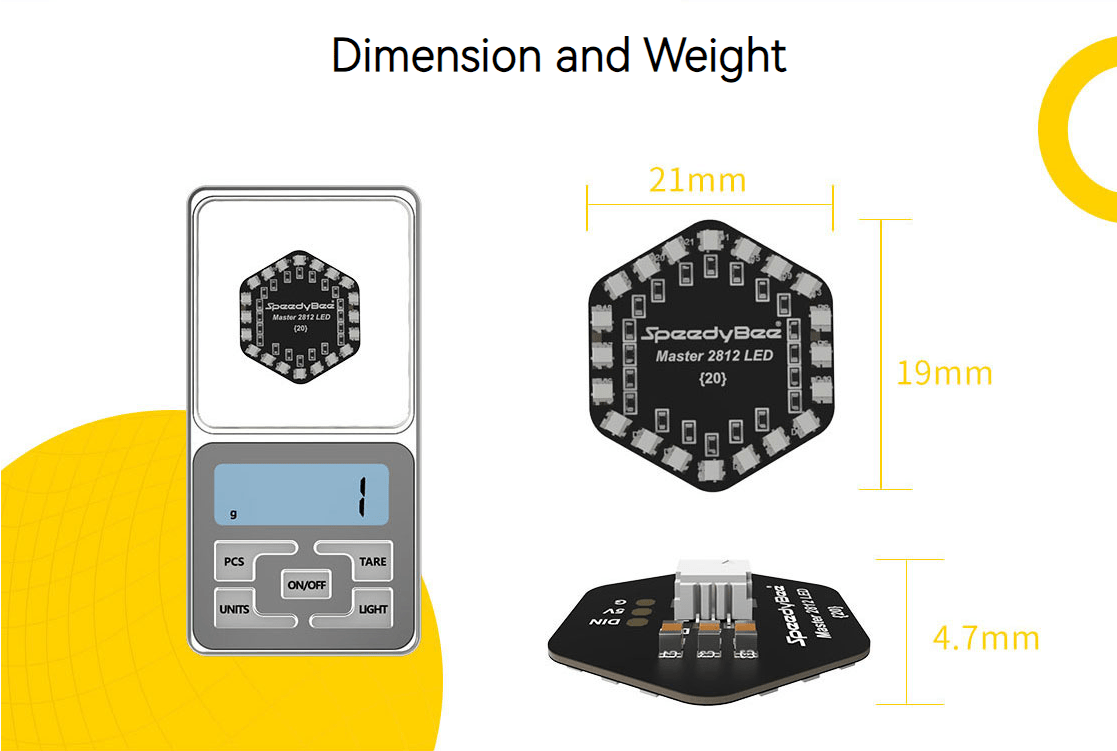 This part is perfect for your SpeedyBee Master 5 v1 & v2 Frame. This hexagonal board contains 20x 2812 LEDs that offer customizable, programmable lighting. It's easy to use - simply plug it into the SpeedyBee F7 V3 FC using the provided cable, or solder it in place. While it's designed for use with the Master 5 frame and SpeedyBee F7 V3 FC, feel free to use it on any other drone build!