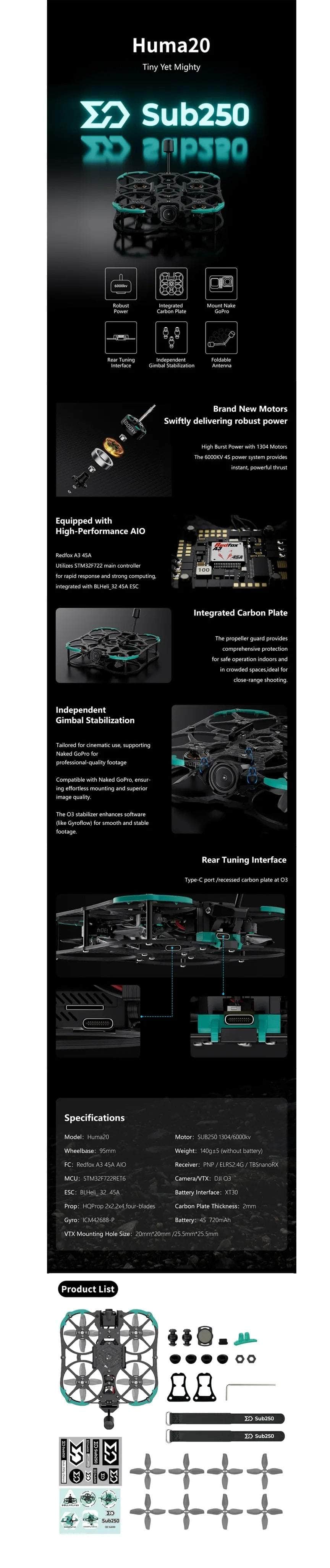 The Sub250 Huma20 is a 2' HD pusher-style cinewhoop drone. Built on a durable 95mm wheelbase, it features Sub250 Redfox A3 45A AIO electronics and powerful 1304 6000KV motors for agile movements and cinematography. Weighing only 140g (without battery) and compatible with 650mAh-750mAh batteries, it's ideal for immersive FPV or capturing high-quality footage.