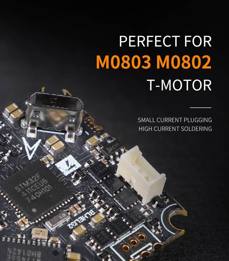 Introducing a new 1S AIO from T-Motor which is perfect for small whoops and toothpick quads! Featuring full BLHeli_32 ESC Firmware which gives you access to features like bidirectional DShot for RPM filtering and up to 96KHz PWM frequency for increased flight time and motor smoothness. The AIO also is equipped with 16MB of blackbox memory and the latest BMI270 gyro so you can tune your quad to perfection. Pick up yours today!