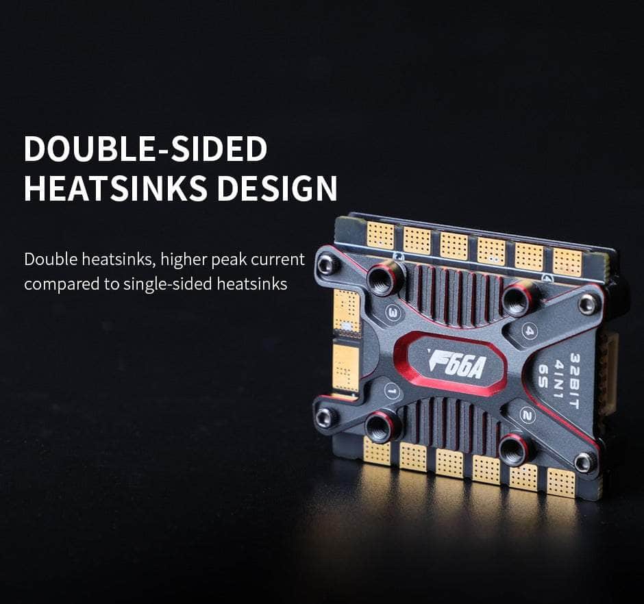 The F66A is a premium-built 4in1 ESC from T-Motor. Fully capable of pushing 6S with 77A burst and a sustained 66A current draw. Equipped with the latest in ESC technology such as 32-bit capability and BLHeli32 firmware.