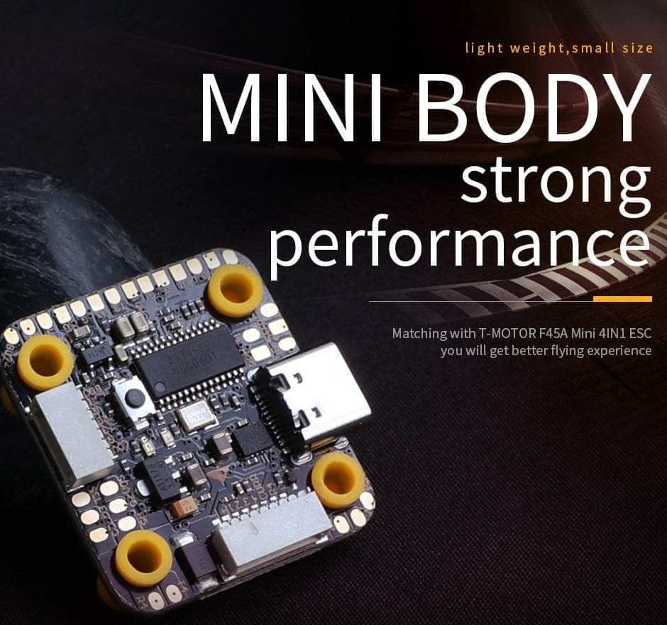 T-Motor's Mini F7 HD Flight Controller is loaded with lots of power and can be connected to the DJI Digital HD FPV System. Compare to standard versions of this FC, the mini FC is lighter and stronger. Featuring F722 high-speed, noise reduction, BMI270 gyroscope, Oneshot125/Oneshot42, Multishot, common PWM signals, PIT switch function, and many other cool features that make this FC unique!
