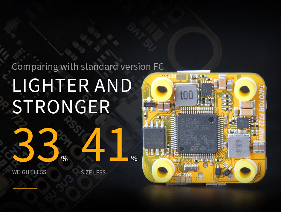T-Motor's Mini F7 HD Flight Controller is loaded with lots of power and can be connected to the DJI Digital HD FPV System. Compare to standard versions of this FC, the mini FC is lighter and stronger. Featuring F722 high-speed, noise reduction, MPU6000 gyroscope, Oneshot125, Multishot, common PWM signals, PIT switch function, and many other cool features that make this FC unique!