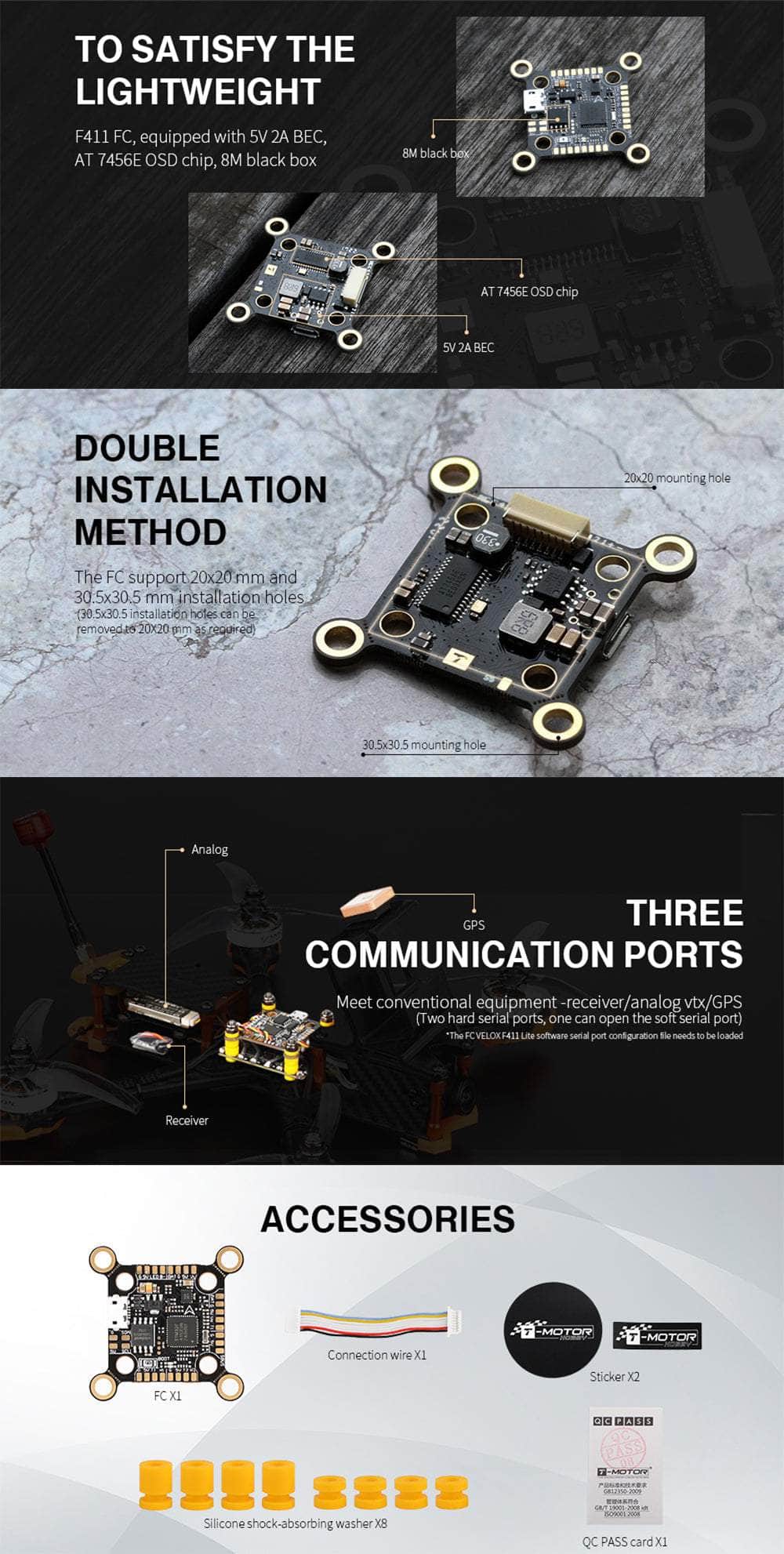 T-Motor's beloved Velox line is back and this time they bring a brand new F411 FC to the table! This FC has 3 communication ports as well as 2 hard serial ports to support all your basic flight functions and accessories such as receivers and GPS.